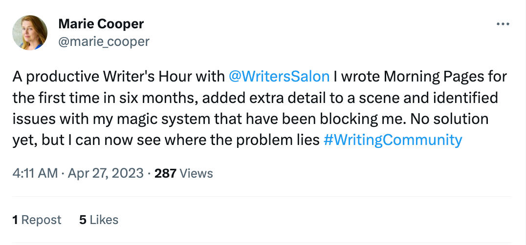 "I love Writers' Hour mornings. It's the most productive hour of my day."