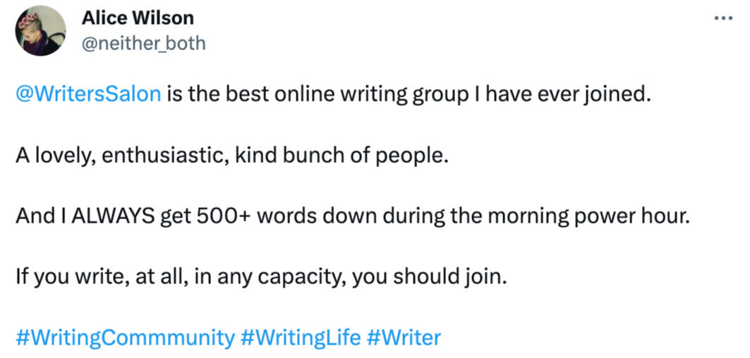 "Writers Hour has the been the prompt I needed to finally start actually writing, after years of daydreaming about it."